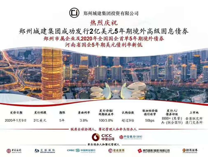 2020年1月9日,锦天城律师作为中国法律顾问服务,协助郑州城建集团投资有限公司(以下简称“郑州城建集团”)于香港联交所、澳门交易所成功发行2亿美元5年期境外高级固息债券,系郑州市属企业及2020年全国国企首单5年期境外债券,创河南省国企5年期美元债利率新低。