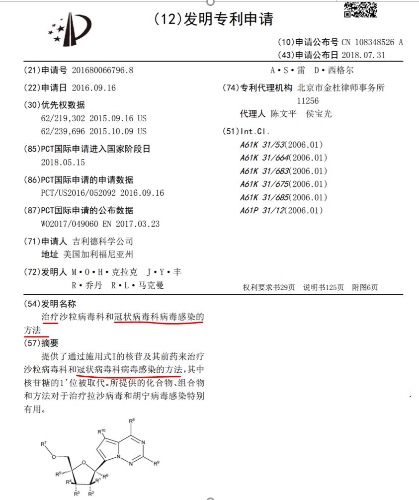 5、 吉利德已经申请过冠状病毒的治疗用途专利,武汉病毒所的专利还可能获得授权吗?