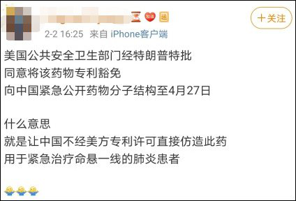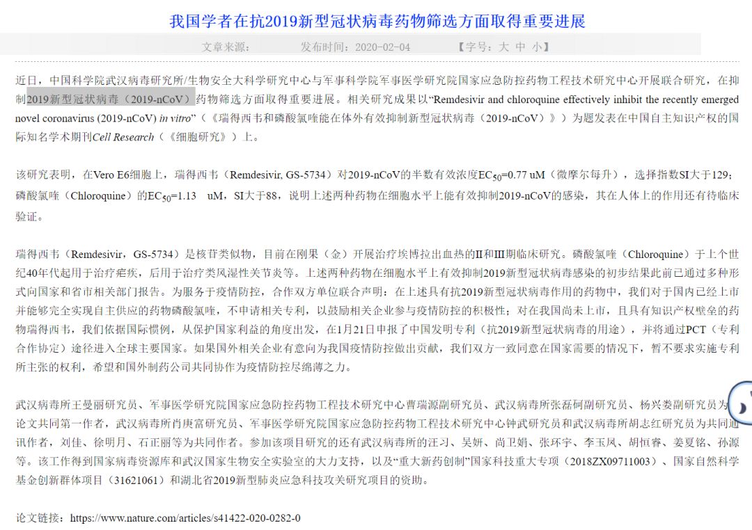 3)这个药用于其它非2019-nCoV的治疗,跟武汉病毒所没有一毛钱关系。