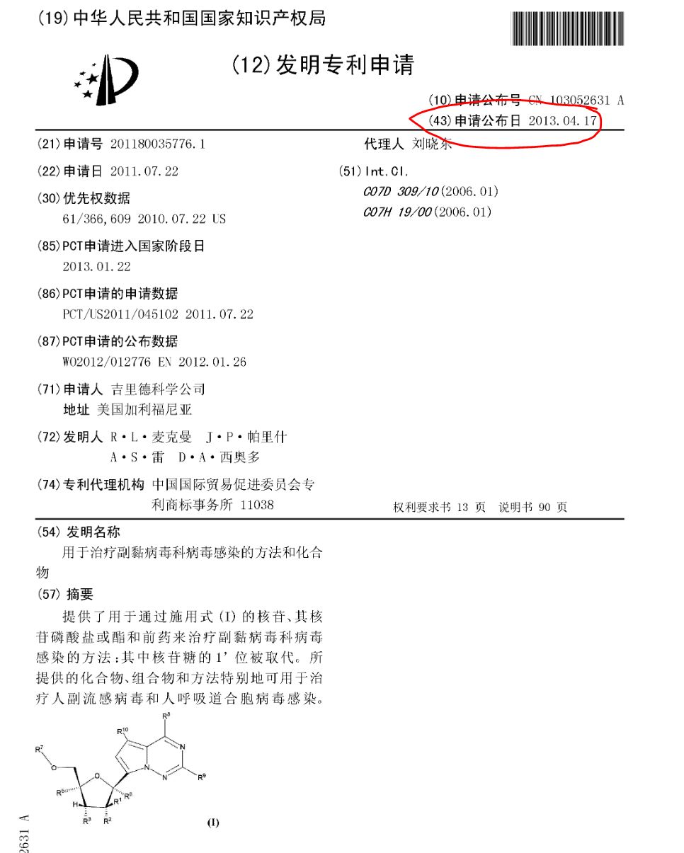其实瑞德西韦药物化合物专利早在2015年已获得授权,专利公开文本中有分子结构有制备方法,至少在2013.04.17就可以从公开途径看到分子结构和制备方法。